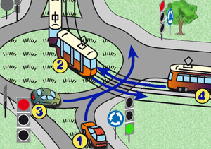 Widząc tramwaj wyjeżdżający z pętli tramwajowej po prawej stronie drogi, kierujący: