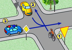 W tej sytuacji, na skrzyżowaniu, kierujący rowerem z numerem 1: