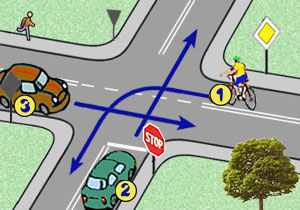 Na tym skrzyżowaniu rowerzysta kierujący rowerem 1, skręcając w lewo: