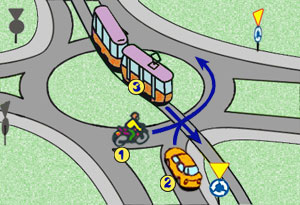 samochód z nr 2 musi ustąpić pierwszeństwa przejazdu tramwajowi z nr 3.