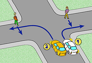 kierujący pojazdem nr 2 nie musi ustępować pieszemu, kierujący pojazdem nr 1 nie musi ustępować pierwszeństwa pieszym, kierujący pojazdami nr 1 i 2 mają obowiązek ustąpienia pierwszeństwa pieszym. |