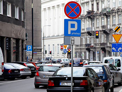 Ciemne tło tabliczki wskazuje jezdnię, a białe - chodnik. Ustawienia samochodu względem jezdni i chodnika mogą być bardzo różne.