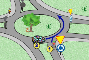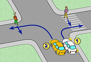 Kierujący samochodem numer 1, skręcając w drogę poprzeczną: