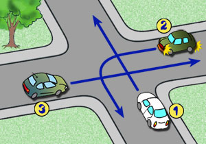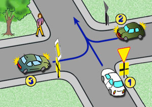 Kierujący pojazdem nr 1 na tym skrzyżowaniu: