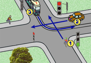 Na tym skrzyżowaniu, rowerzysta widząc światło zielone:
