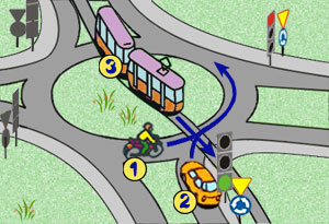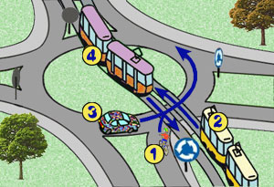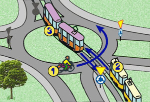 Widząc tramwaj wyjeżdżający z pętli po prawej stronie drogi, kierujący rowerem: