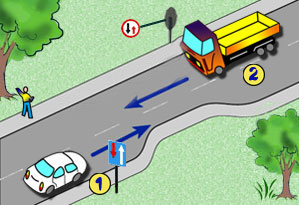 W sytuacji, kiedy zwężony odcinek jezdni znajduje się na wzniesieniu, pierwszeństwo przejazdu posiada pojazd który jedzie pod górę.