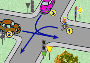 c) pojazd z numerem 3 musi ustąpić pierwszeństwa rowerzyście.