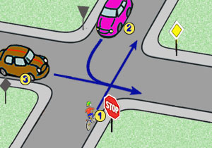 b) rowerzysta musi ustąpić pierwszeństwa pojazdowi numer 2,