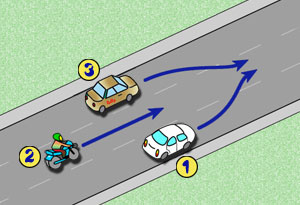 b) motorowerzysta z numerem 2 ma pierwszeństwo przed pojazdem numer 3,