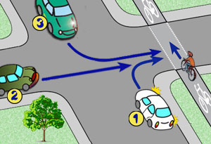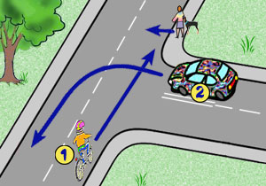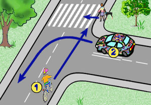 ma pierwszeństwo tylko przed pojazdami, które skręcają w drogę poprzeczną, powinien przejechać przed pojazdem numer 2, musi ustąpić pierwszeństwa pojazdom silnikowym. |