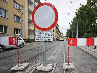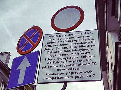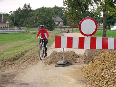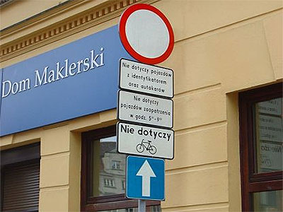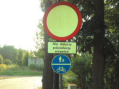 Umieszczona pod znakiem tabliczka T-22 wskazuje, że zakaz nie dotyczy rowerów jednośladowych.