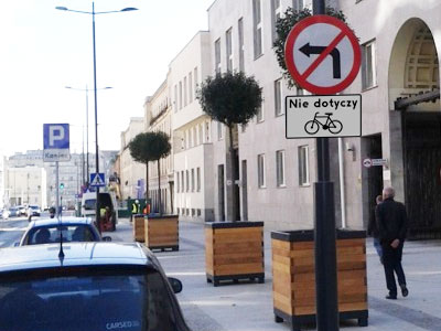 Umieszczona pod tabliczka T-22 wskazuje, że znak nie dotyczy rowerów jednośladowych skręcających na drogę dla rowerów, lub wyznaczony na jezdni pas ruchu przeznaczony dla tych pojazdów (tzw. kontrapas).