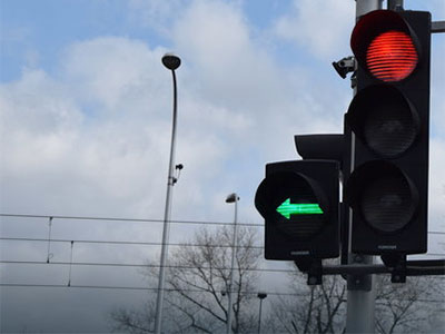 Nadawany przez sygnalizator sygnał czerwony, wraz z sygnałem w kształcie zielonej strzałki oznacza, że dozwolone jest skręcanie w kierunku wskazanym strzałką w najbliższą jezdnię na skrzyżowaniu, pod warunkiem że kierujący: