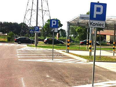 Tabliczka umieszczona pod znakiem D-18 wskazuje koniec miejsca przeznaczonego na postój - jak na przykładzie obok. Poniżej zobaczyć możesz nieprawidłowe zastosowanie tej tabliczki: