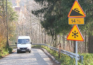 Na przykładzie obok, 14% oznacza, że droga na długości 100 metrów opada aż o około 14 metrów.